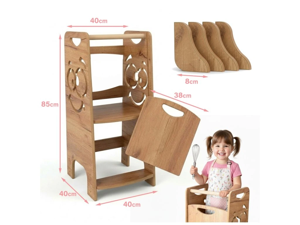 Děti milují zkoumat svět, ale někdy je potřeba mít je pod kontrolou. Naše učící věž je navržena tak, aby dítě nemohlo odejít bez vaší pomoci. Má speciální příčku a odnímatelnou pevnou desku jako bezpečnostní zábranu, kterou snadno sundáte podle potřeby. 🔧