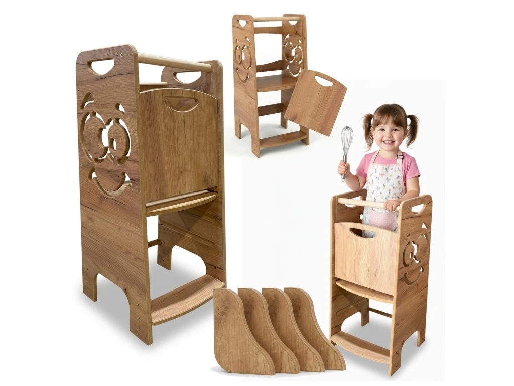 Naše učící věž je pevná a spolehlivá, zvládne i zátěž dospělého. Užijte si společné chvíle v kuchyni bez starostí. 👨👩👧👦🍳