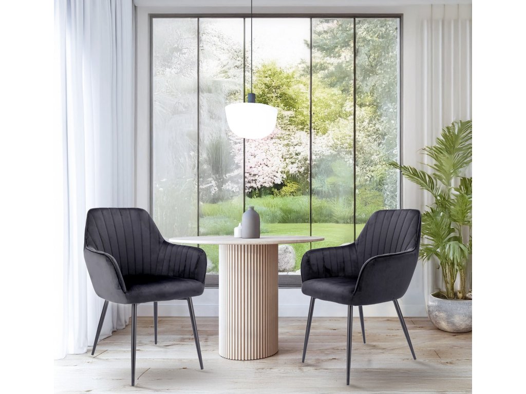 ➡️ Pevná, sametová židle je vybavena měkkým sedákem a vysokým opěradlem s dekorativním prošíváním. Celý design působí lehce díky štíhlým černým nohám, které dodávají vizuální lehkost a zároveň zajišťují stabilitu. Výška opěradla, područky a měkkost sedáku zaručují, že je židle neuvěřitelně pohodlná.