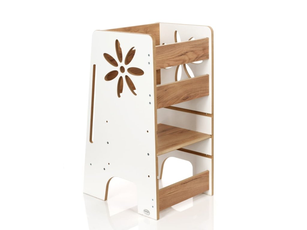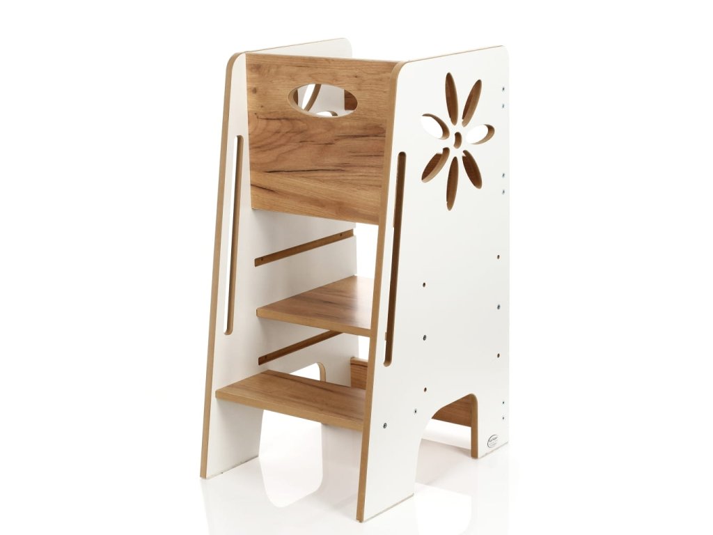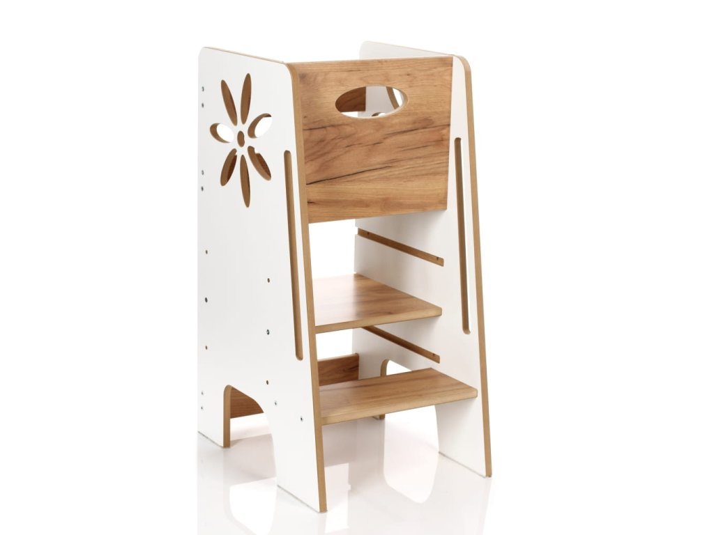 Vzhledem k tomu, že Kuchyňský pomocník mají používat jak nejmenší, tak i trochu větší děti, musí být nastavitelný a nastavitelný podle jejich výšky. Náš produkt má třístupňové výškové nastavení plošiny, které lze provést bez nutnosti demontáže celého kusu nábytku. Navíc, aby byla zajištěna bezpečnost dětí, jakmile je plošina nastavena na příslušnou úroveň, je zablokována, takže se nemůže vysunout.